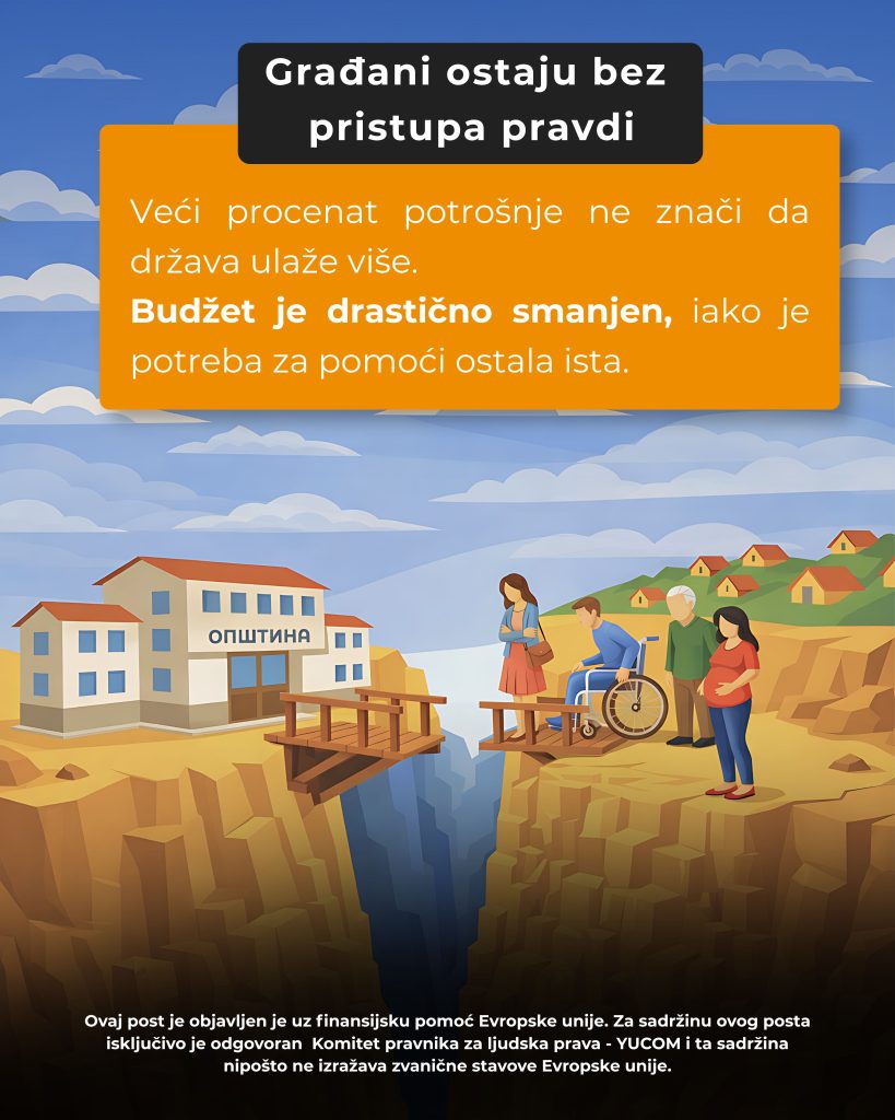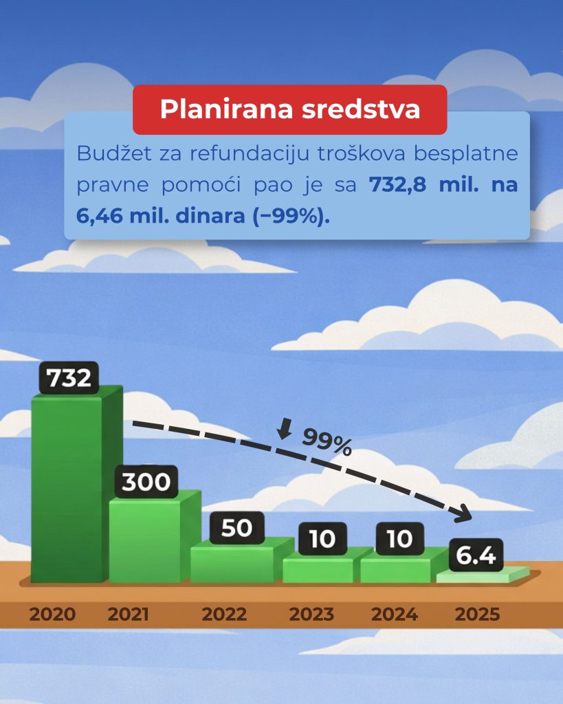 📉 Finansiranje besplatne pravne pomoći u Srbiji drastično je smanjeno. Iako podaci pokazuju visok % potrošnje (71% u 2025), realnost je drugačija:
